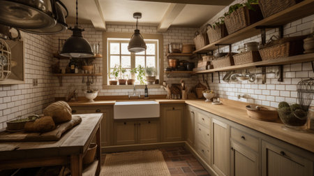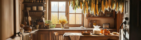 Cozy farmhouse style kitchen interior, room filled with all sorts of appliances and details rustic kitchen, banner
