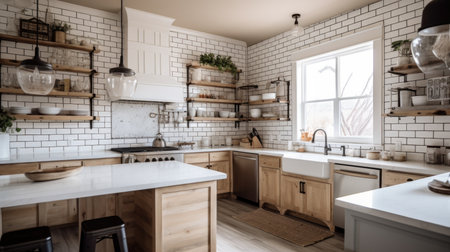 Interior design of Kitchen in Farmhouse style with Farmhouse sink decorated with Subway tile, Wood, Marble, Ceramic material. Open concept architecture. Generative AI AIG24.