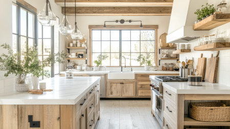 Bright farmhouse kitchen interior with wood accents and island