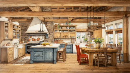 A rendering of a kitchen with wooden beams and a table, AI
