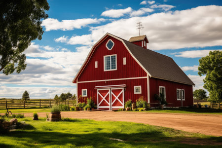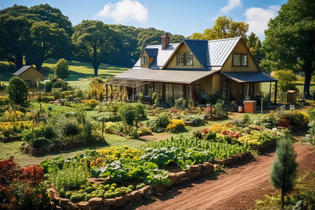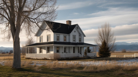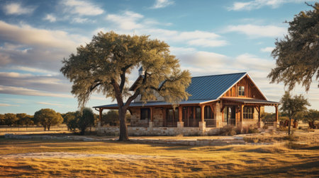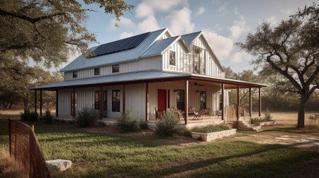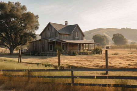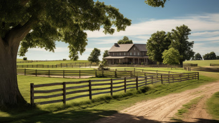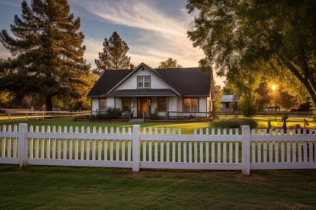 ranch house with rustic surrounding and picket fence, created with generative ai