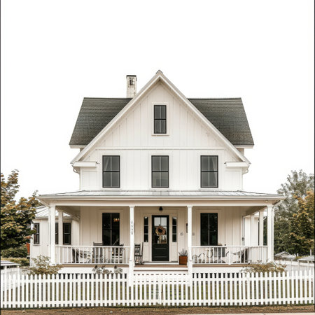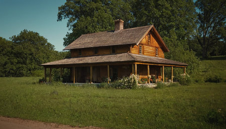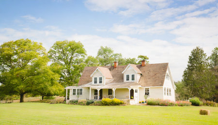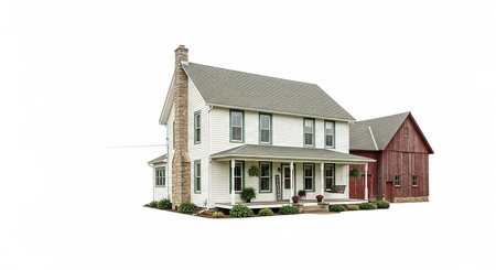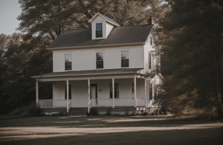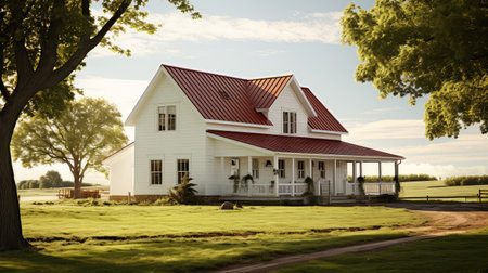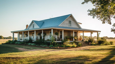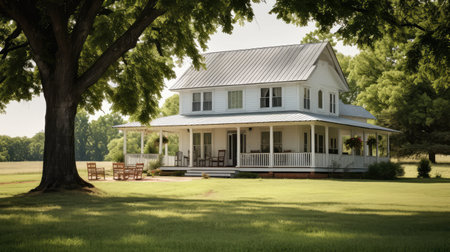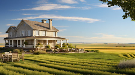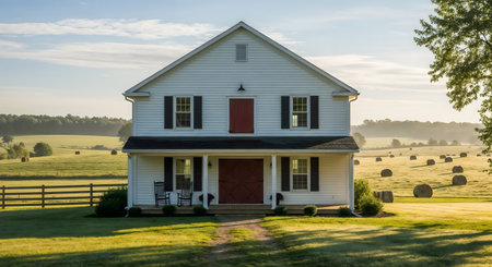 Traditional farm house with a large porch, wooden facade, and surrounding fields, representing rural architecture.