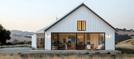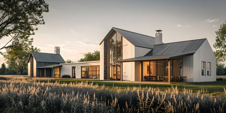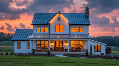 A sleek farmhouse stands out against a dramatic sunset sky over a vast open field.