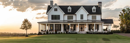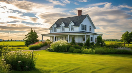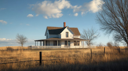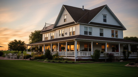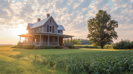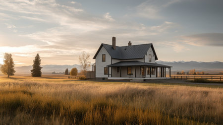 White clapboard farmhouse stands gracefully amid expansive golden wheat fields as the sun sets, painting the sky with warm hues and casting a serene ambiance over the landscape.
