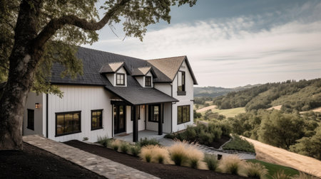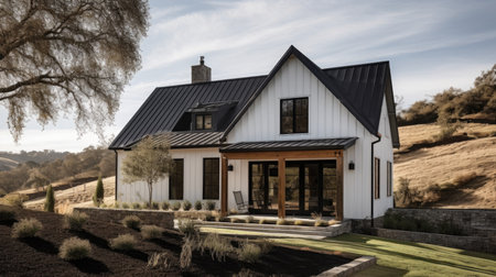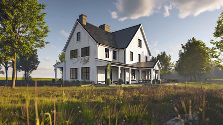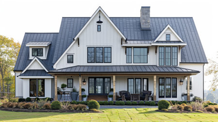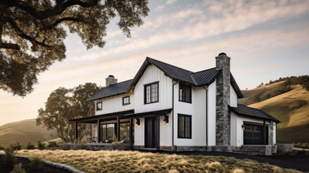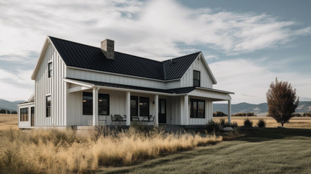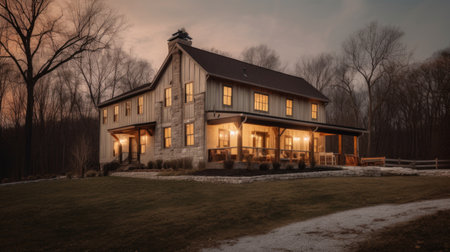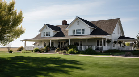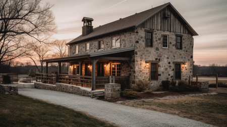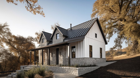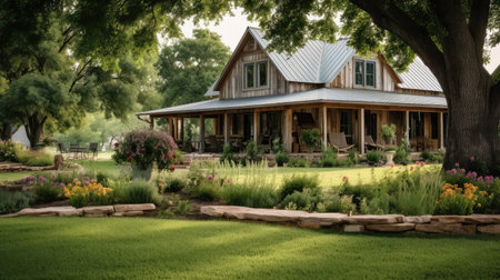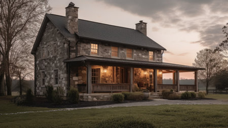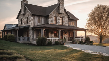 modern farmhouse with stone exterior and front porch, surrounded by green lawn, created with generative ai
