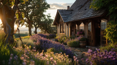 Charming cottage surrounded by vibrant lavender flowers, basking in warm glow of sunset. inviting pathway leads to cozy entrance, creating serene and picturesque atmosphere