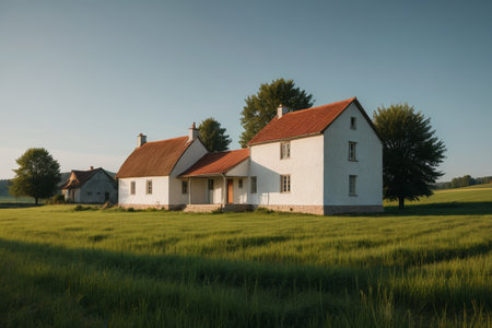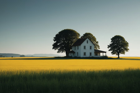 two houses and tall grass in a field, captured in the style of light amber and sky-blue hues. this uhd image showcases a 20th-century scandinavian aesthetic, with its everyday life charm and light-filled scenes. photographed by caras ionut, this picture beautifully portrays the serene beauty of rural landscapes. ai generated