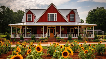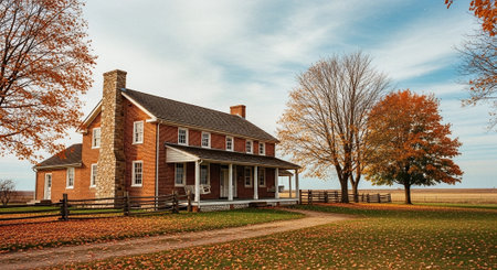 a sunrise shoot with a red brick farmhouse featuring gabled entry, created with generative ai