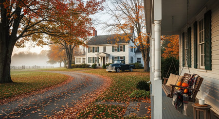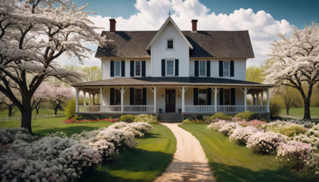 This charming colonial house features a classic white facade, surrounded by trees and nature, creating a serene ambiance in a peaceful rural setting.