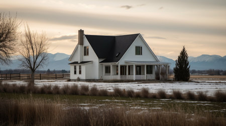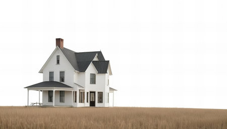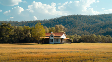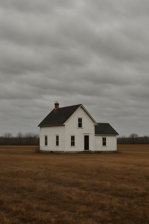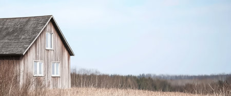 Rural landscape with a simple house and cloudy sky. Isolated farmhouse in field. Minimalist architecture in nature.