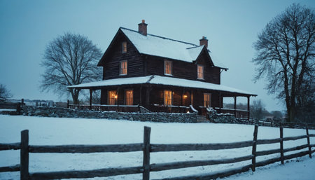 A dark wooden farmhouse with glowing windows sits in a snowy winter landscape during twilight, surrounded by bare trees and a wooden fence.