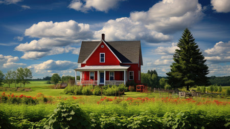 Panoramic view of farm house on green meadow and blue sky with clouds