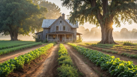 rural scene with a weathered farmhouse, lush green crops, and towering trees glowing under the golden morning sunlight, evoking timeless countryside charm.