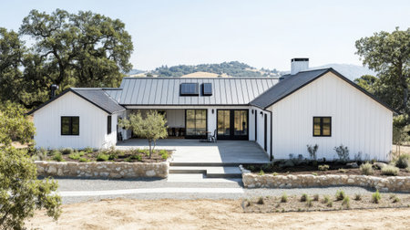 modern farmhouse with barn and grazing horses on sprawling property, created with generative ai