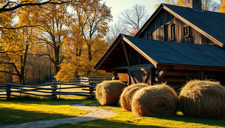 Beautiful autumn landscape with hay bales and wooden house in the park
