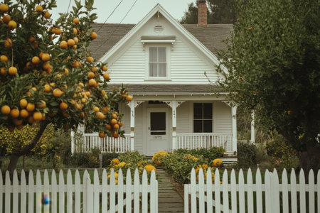 A lovely white house stands amidst vibrant orange trees, with ripe fruit hanging low. The well-maintained yard features a white picket fence and lush greenery, creating a peaceful atmosphere.