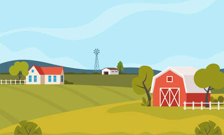 Farm scene with red barn and windmill, trees, fence, haystack. Rural landscape. Agriculture and farming concept. Cute vector illustration