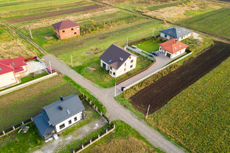 Aerial photo of a typical Polish hosing estate in the mountains towns, taken on a sunny part cloudy day using a drone, showing the housing estate and farmers fields