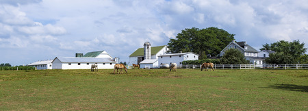 FARMSTEAD, USA - JULY 13, 2010: typical amish farm house with silo ang grazing horses