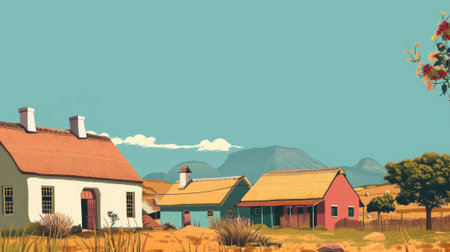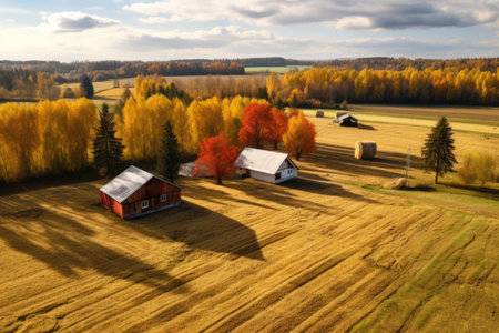 Beautiful view of rural housing surrounded by countryside in early autumn, generative ai