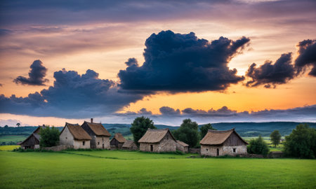 Lush green farmland with cozy homes nestled among verdant fields in a rural landscape