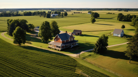 an aerial drone photo captures an isolated country house, showcasing the layered and atmospheric landscapes in the style of the vancouver school. shot with a petzval 85mm f22 lens, the image features moody lighting, with dark gray and gold tones creating an emotive atmosphere. the photo exhibits the signature fields of color, characteristic of the kurzgesagt style. ai generated