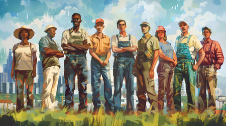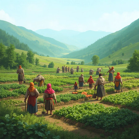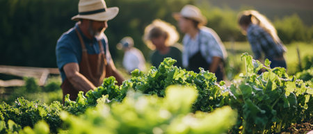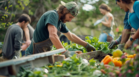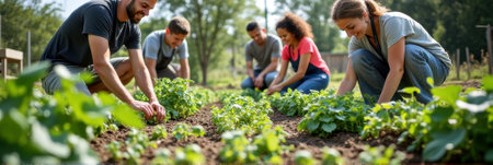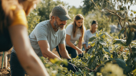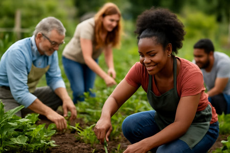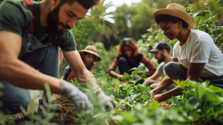 A group of diverse individuals engages in gardening activities, highlighting teamwork and connection to nature while nurturing plants and crops in a sunny outdoor environment.