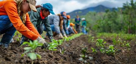 Team planting trees to reforest field at sunrise. Protecting environment, combat deforestation. Sustainable future growth with people taking action.