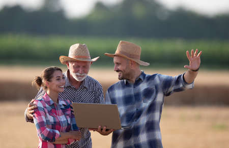Group of happy farmers cooperating while working on a computer at agricultural field.