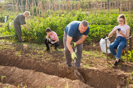 Man gardener digging soil in vegetable garden