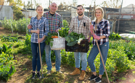 Female and man workers standing in field after harvesting at local farmers garden bed