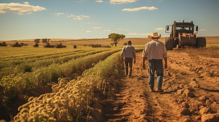 Two farmers walking in a field with a tractor on a sunny day