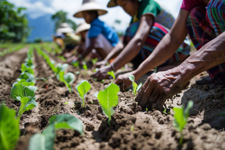 Group of farmers working in the field, planting crops in the countryside