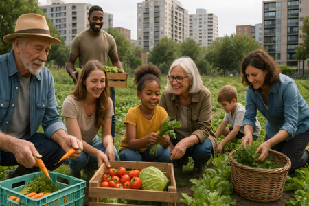 Diverse group of people harvesting fresh vegetables in a community garden surrounded by city buildings, promoting sustainable urban living