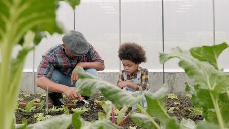 Father and son gardening together planting strawberry plants in the garden, Man and child boy gardening in vegetable in the backyard, family and relax outdoor activities