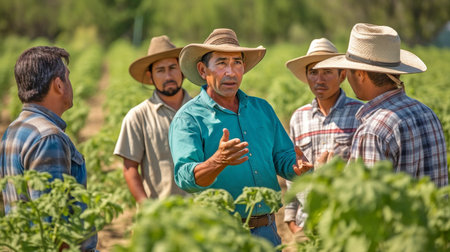 A Farmers collaborating on sustainable practices in lush green field