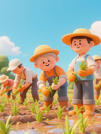 3d illustration of a group of farmer planting seedlings in the field
