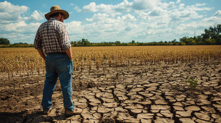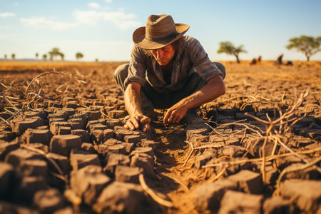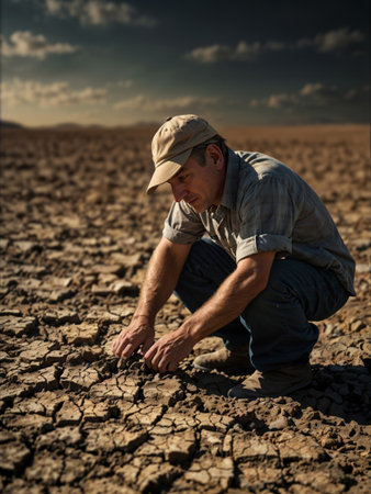 A farmer examining his dry and cracked farmland, worrying about the drought affecting his crops.