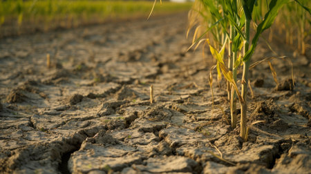 A close-up view of cracked and dry soil in a cornfield illuminated by bright sunlight, showcasing the impacts of drought on agriculture and crop growth.