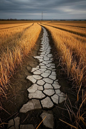 Dry cracked earth in a wheat field at sunset creates a stark landscape, highlighting the impact of climate change and drought on agriculture and ecosystems