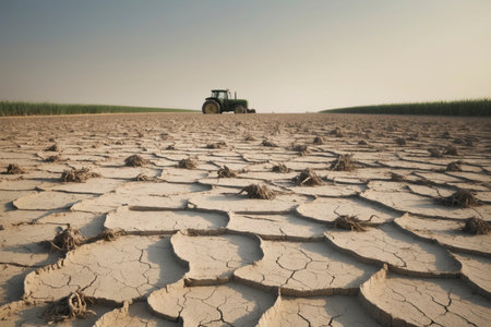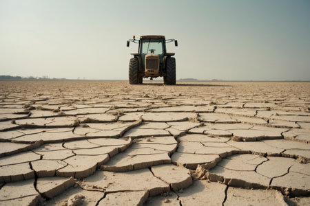 A tractor stands motionless on cracked, parched farmland. The image illustrates the effects of drought, water scarcity, and climate change, which render agricultural land infertile and threaten food production.