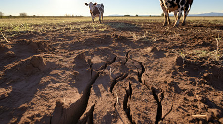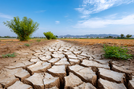 A close-up view of cracked, dry soil in an agricultural field during a drought. The image highlights the effects of climate change on farming and the urgent need for sustainable practices.