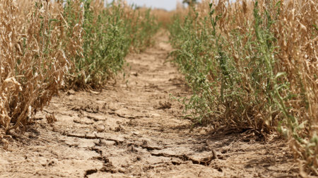 Dried plants and cracked soil show the impact of drought in a rural field under a bright sun.