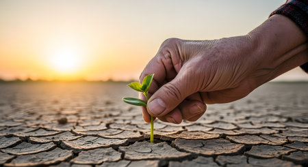 A person's weathered hand gently touches a fragile green sprout growing resiliently from dry, cracked soil in a barren landscape at sunset. The image is a powerful and hopeful symbol of environmental stewardship, conservation, and nurturing new life in the face of climate change and drought.