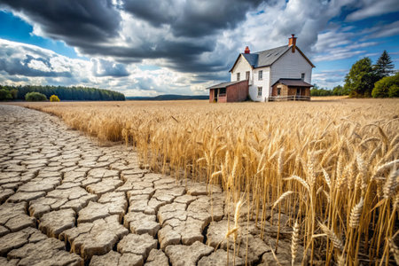 A thought-provoking image of a drought-stricken landscape with cracked earth and wilting crops, illustrating the impact of climate change on agriculture and food security.