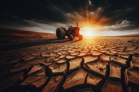 Scorched earth arid soil desert heat wave global warming drought, abandoned rusty tractor, stormy sky, apocalyptic scene