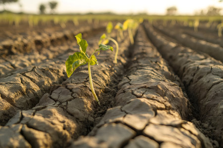 A close-up view of young plants breaking through cracked earth under a soft sunset. This image symbolizes resilience and hope in challenging conditions, showcasing the power of nature.