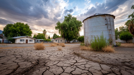 Rainwater tank standing empty in a cracked yard. Water crisis and water shortage in summer during long drought is a global problem of drought on the planet