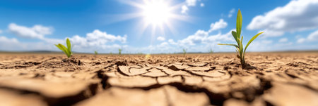 A solitary plant pushes through cracked, arid earth, reaching towards a bright, expansive sky. The image displays a dry, cracked texture contrasted by the vibrant green of the resilient vegetation. Sunlight illuminates the landscape, possibly suggesting a harsh environment. Suitable for concepts of perseverance or environmental themes, for commercial or editorial applications.