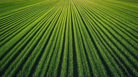 A stunning aerial view showcasing a bright green field, highlighting the intricate patterns and lines formed by rows of crops under a clear sky. Perfect for nature and agriculture themes.